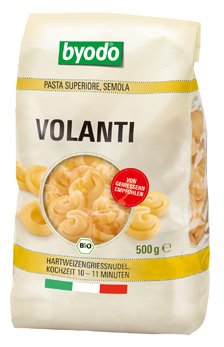 Die Volanti, semola von Byodo werden aus feinstem italienischen Bio-Hartweizengrieß hergestellt. Die originelle Form überzeugt mit einem schönen Biss.