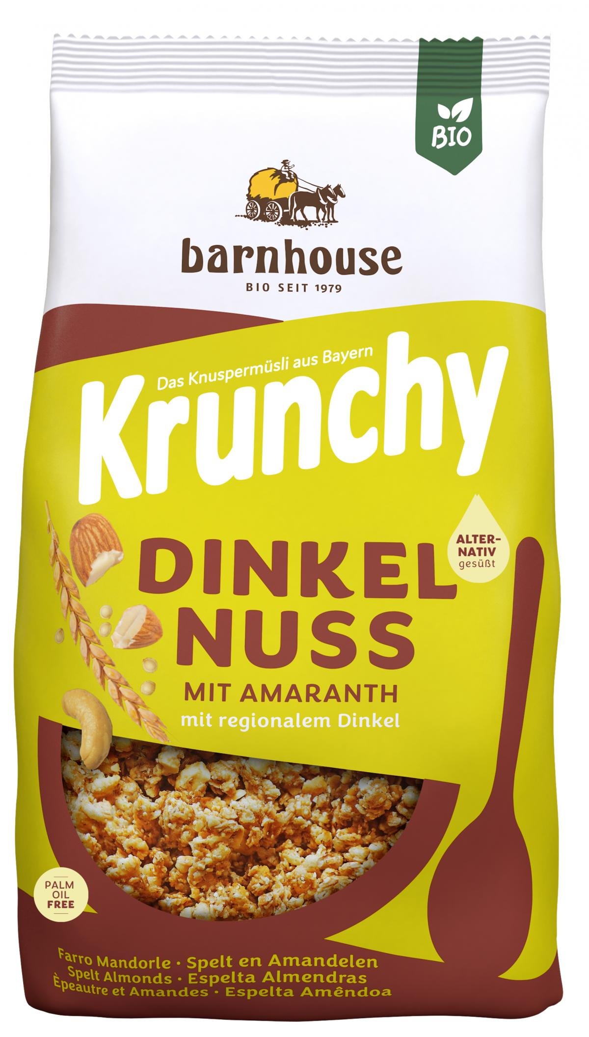 Im Krunchy Amaranth Dinkel-Nuss harmoniert das Urgetreide mit Cashew-Nüssen und feinen, gerösteten Mandelstiften. Alternativ gesüßt mit Agaven- und Reissirup und locker gebacken mit europäischem Sonnenblumenöl!