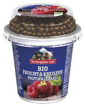 JOGHURT mild*, 10 % Himbeerzubereitung* (Himbeeren*, Rohrohrzucker*, Tapiokastärke*, Verdickungsmittel Johannisbrotkernmehl*, Rote Betesaft* aus Konzentrat), 9 % Schokoladen-GETREIDEbällchen* (Schokoladenkuvertüre* aus Zucker*, VollMILCHpulver*, Kakaobutter*, Kakaomasse*, Emulgator SOJAlecithin*/ Getreidebällchen* aus Maisgrieß*, WEIZENvollkornmehl*, Rohrohrzucker*, Meersalz, Überzugsmittel: Gummi Arabicum*, Honig*), Rohrohrzucker*. Kann zusätzlich Spuren von SCHALENFRÜCHTEN enthalten.