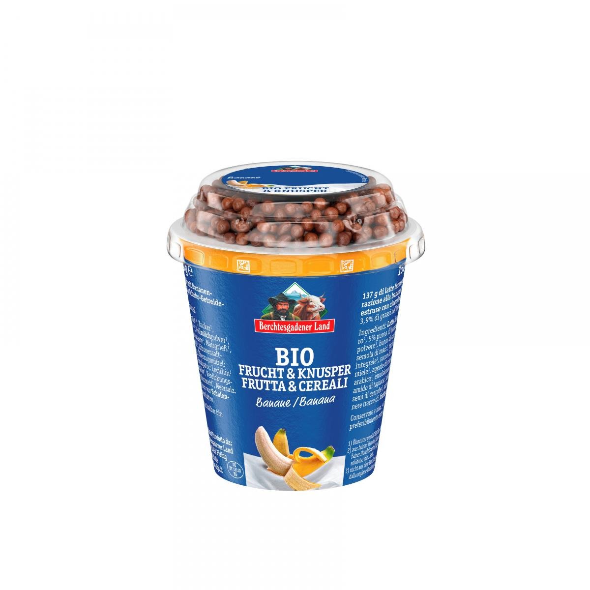 JOGHURT mild*,**, 12 % Bananenzubereitung* (Bananen*,**, Rohrohrzucker*, Tapiokastärke* , Zitronensaft* aus Konzentrat, Verdickungsmittel Johannisbrotkernmehl*), 9 % Schokoladen-GETREIDEbällchen* (Schokoladenkuvertüre* aus Zucker*, VollMILCHpulver*, Kakaobutter*, Kakaomasse*, Emulgator SOJAlecithin* / Getreidebällchen* aus Maisgrieß*, WEIZENvollkornmehl*, Rohrohrzucker*, Meersalz, Überzugmittel: Gummi Arabicum*, Honig*), Rohrohrzucker*,**. Kann zusätzlich Spuren von SCHALENFRÜCHTEN enthalten.