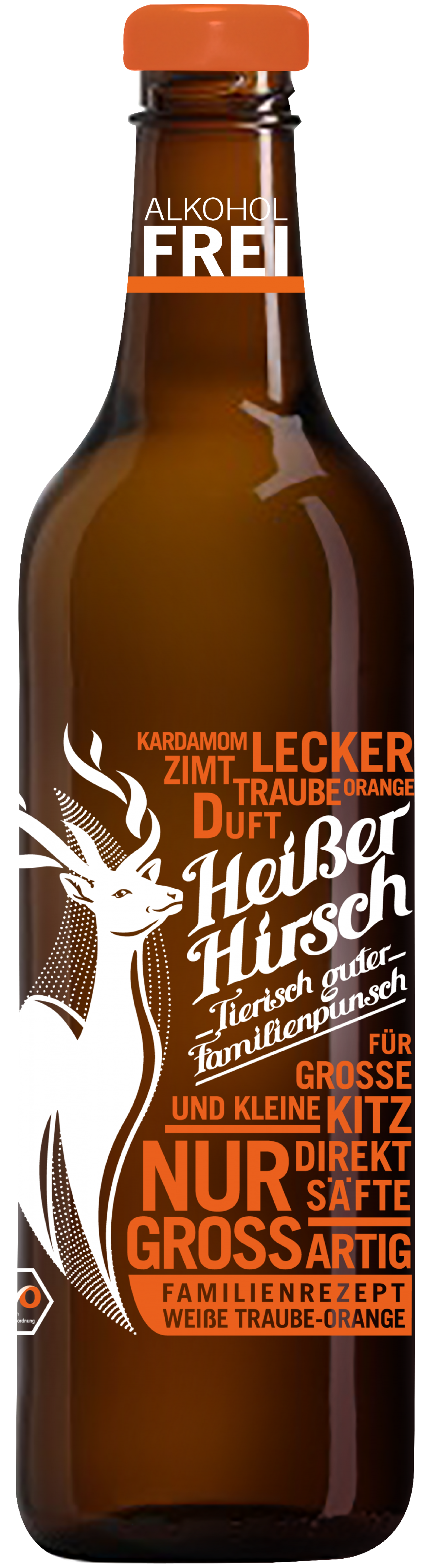 Für das Familienrezept ,,Weiße Traube - Orange´ werden 100% naturtrübe Direktsäfte verwendet. Weiße Trauben, Äpfel von Streuobstwiesen, Orangen und Birnen. Auch hier werden zum Verfeinern ausschließlich natürliche BIO-Gewürzextrakte verwendet - Zucker wird keiner zugesetzt. Zimt, Nelken, Kardamom, Piment, Macisblüten, Orangen- und Zitronenschalen verbreiten winterlichen Duft im Heimatrevier.