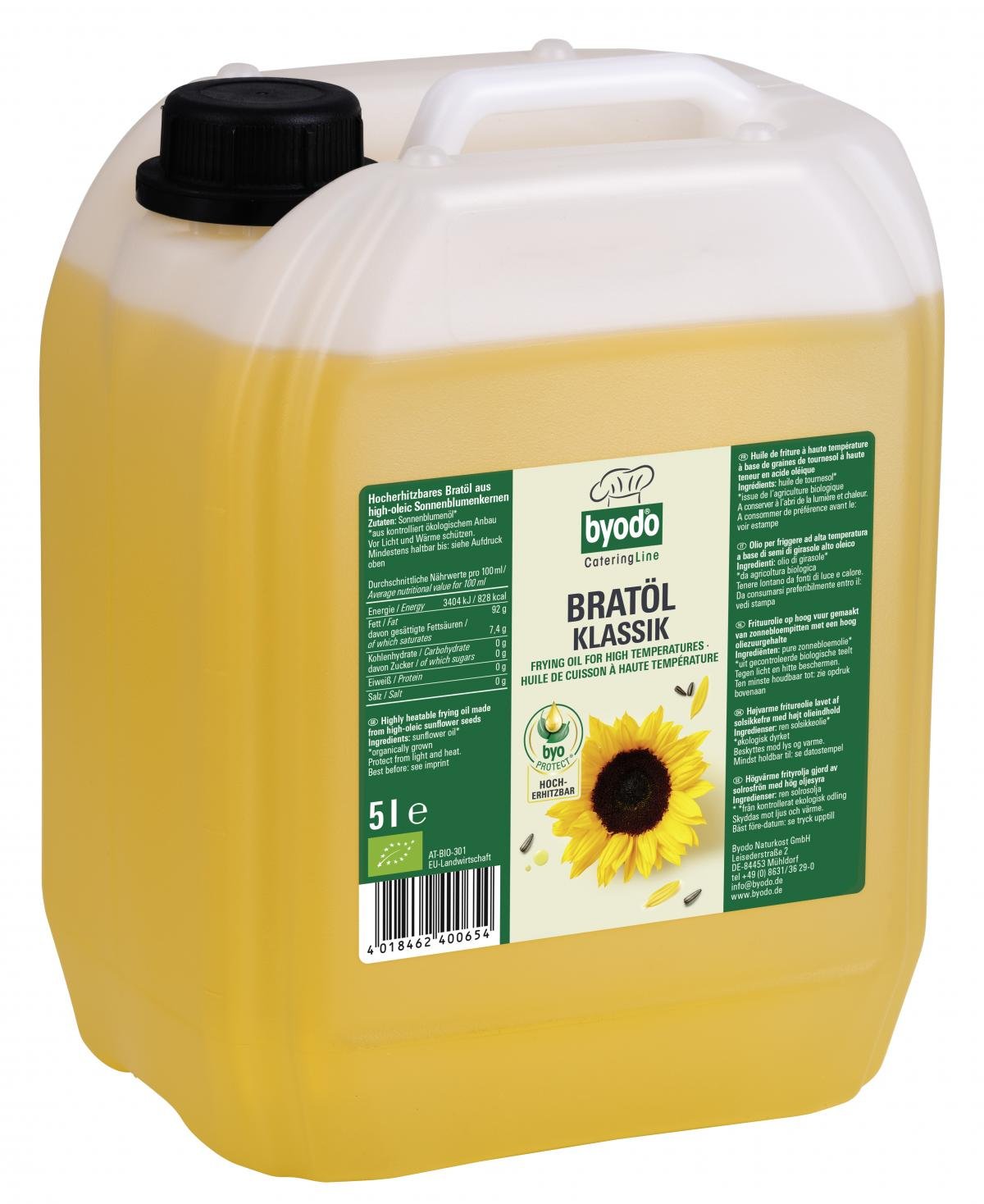 Das Bratöl Klassik von Byodo wird ausschließlich aus high oleic Bio-Sonnenblumenkernen gepresst. Die spezielle Sorte enthält besonders viel Ölsäure, eine einfach ungesättigte Fettsäure, die gut erhitzbar ist. Eine sorgsame Desodorierung des kalt gepressten Öls sorgt zudem dafür, dass hitzeempfindliche Farb- und Geschmacksstoffe im Öl reduziert werden. So wird das klassische Bratöl hocherhitzbar und besonders mild im Geschmack.