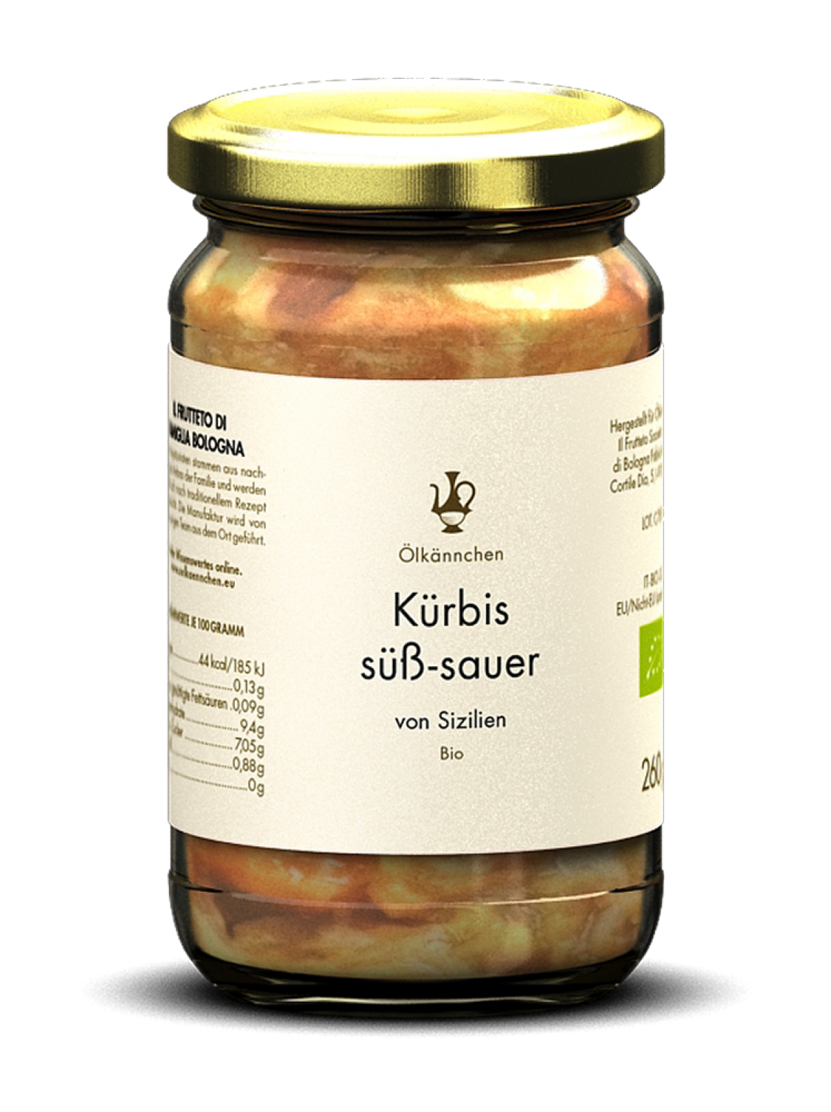 Ölkännchen Bio Kürbis süß-sauer - ein Klassiker der sizilianischen Küche. Ursprünglich stammt das Gericht Kürbis süß-sauer von einem Markt Palermos im 18ten Jahrhundert. Im Zentrum des Marktes stand damals wie heute ein Brunnen mit sieben Wasserhähnen (ugs. auf sizilianisch: cannoli). Mit Kürbis ahmten die einfachen Leuten ein Fleischgericht der Wohlhabenden nach, in welchem nicht Kürbis, sondern Leber mit süß-saurer Soße kombiniert wurde. So nennen Sizilianer das Gericht noch heute ´fegato dei sette cannoli´- die Leber der sieben Wasserhähne. In einem würzigen Sud aus Zwiebeln, Zucker und Weißweinessig wird der gedünstete Kürbis mariniert. Kürbis süß-sauer schmeckt kalt und leicht erwärmt, nach Wahl auch mit gehackter Minze bestreut. Vorzüglich als pikante Beilage zu Fleischgerichten oder mit unseren anderen sizilianischen Antipasti zu geröstetem hellen Brot! Alle Hauptzutaten stammen aus eigenem, nachhaltigem Anbau der Familie Bologna und werden erntefrisch eingekocht. Die handwerkliche Verarbeitung der Bio-Delikatesse erfolgt nach Großmutters traditionellem Rezept. Il Frutteto, eine kleine ökologisch wirtschaftende Manufaktur in