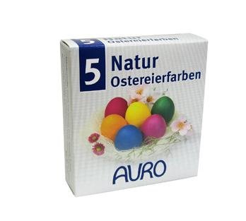 Färben Ostereier auf rein natürlicher Basis mit den Farbstoffen Norbixin, Indigotin (Indigokarmin), echtem Karmin und kupferhaltigen Komplexen der Chlorophylle und Chlorophylline.